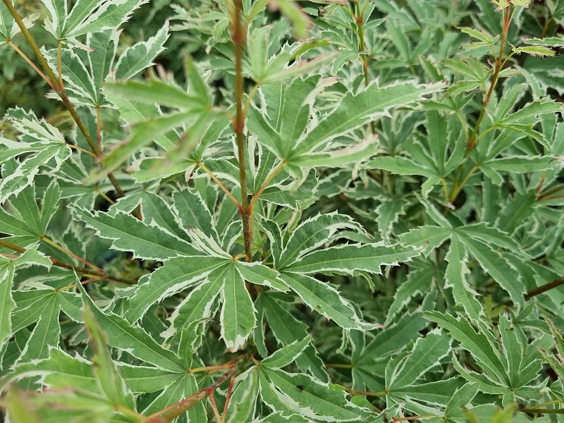 Acer palm. 'Extravaganza' - japanse esdoorn Een iets bonte look, met witte en roze strepen in het
