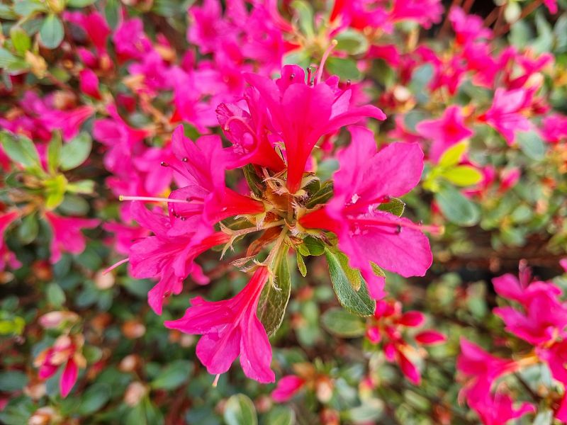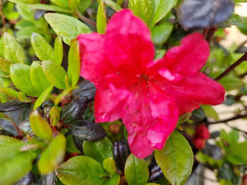 Azalea Knaphill 'Satan' - planten in turf, heideplant GEUREND. Opgaande groei, snoeien na de