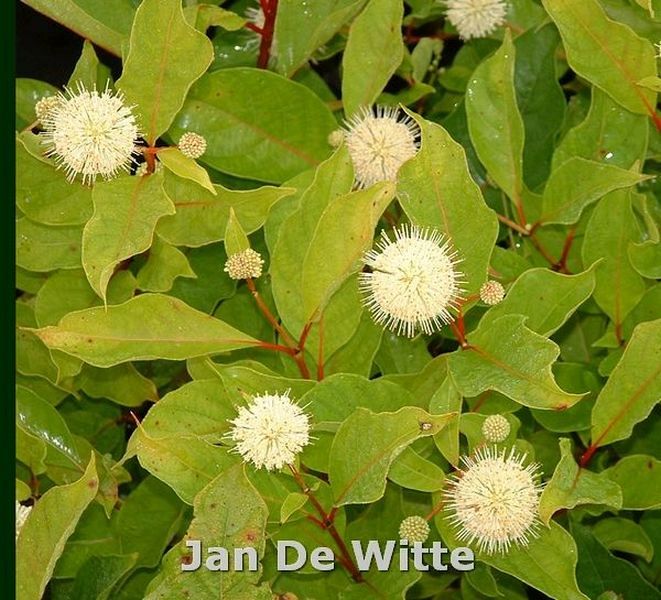 Cephalanthus occ. 'Magical Moonlight' - kogelbloem, bloei, zoete geur voor vlinders en hom Bloeit met opvallende witte knikkervormige stekelige